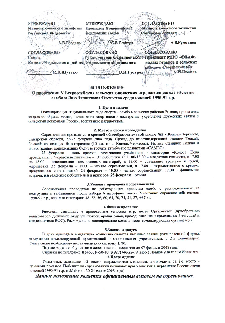 В период с 23 по 25 февраля в самом большом селе России Кинель-Черкассы (Самарской области) прошли V Сельские юношеские Игры по самбо, посвященные дню защитника отечества и Соревнования собрали более 200 спортсменов из 35 регионов России (Калининградская обл., Иркутская обл., Курганская обл., Рязанская обл., Республика Дагестан, Республика Адыгея и тд.). В открытии соревнований приняли участие: Глава Кинель-Черкасского района, Депутат Государственной Думы, Представитель Всероссийской федерации самбо, Представитель Министерства Сельского хозяйства России, Заместитель председателя Правительсва Самарской области, Председатель федерации профсоюзов Самарской области и другие официальные лица. |