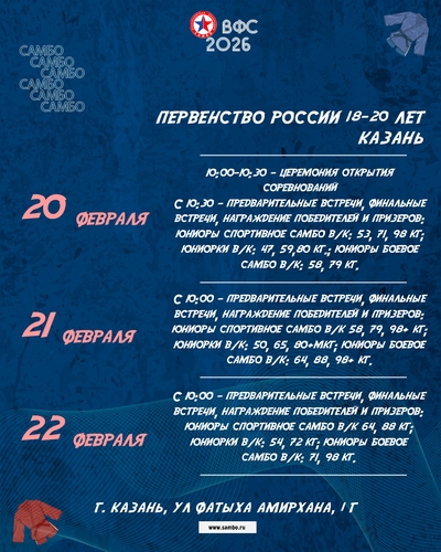 С 20 по 22 февраля в Казань состоится Первенство России по самбо среди юниоров и юниорок, а также юниоров по боевому самбо - один из ключевых стартов национального календаря, по итогам которого будет сформирован состав молодёжной сборной страны.