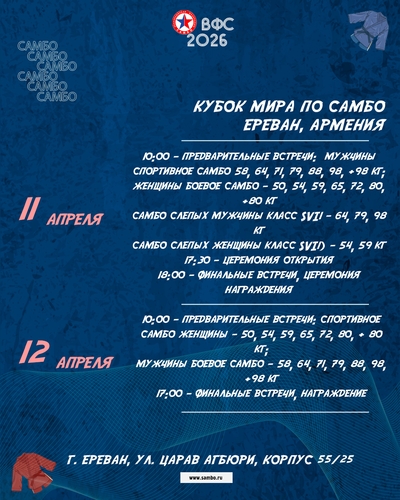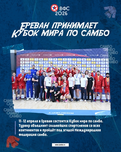 11–12 апреля в Ереван состоится Кубок мира по самбо. Турнир объединит сильнейших спортсменов со всех континентов и пройдёт под эгидой Международная федерация самбо.